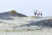 Een rendier loopt over een met mos en korstmossen bedekte heuvel.