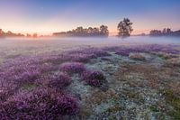 Dit was een plek dit ik al eens in de winter gefotografeerd had. Op zich best vreemd, want met de bloeiende heide zou het waarschijnlijk een veel betere plaat opleveren. Zo gezegd zo gedaan. Met de volop bloeiende heide, een beetje mist en de gloed van de aankomende zonsopkomst leverde het dit plaatje op.
