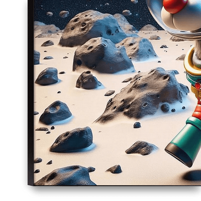 Het kunstwerk toont een groep rendieren in astronautenpakken die een slee-team door een asteroïdenveld in de ruimte trekken. De rendieren zijn gekleed in futuristische pakken in rood en groen, passend bij de kersttraditie. Hun helmen zijn groot en bolvormig, zodat de dieren hun karakteristieke gewei kunnen laten zien. Op de voorgrond is…