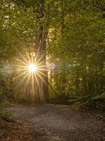 Portret bij het Renkums Beekdal in Renkum, Gelderland, met zicht op een wandelpad in het bos, en de ochtendzon die heerlijk schijnt tussen de bomen, wat voor een mooie lensflare zorgt.