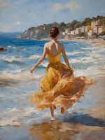 Ervaar de magie van het moment met mijn nieuwste impressionistische kunstwerk. Een vrouw rent op het strand, gehuld in een bewegende chiffon jurk die meedeint op de wind. Het sublieme spel van licht en schaduw vangt de romantische kleuren van de ondergaande zon, waardoor dit schilderij een tijdloze uitdrukking wordt van serene…
