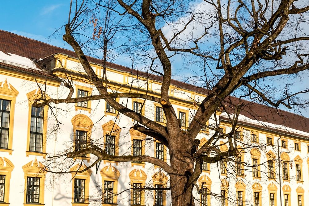 Residentie Kempten in Allgäu in de winter met kale boom Duitsland