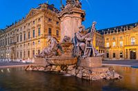 Frankoniabrunnen fontein met Walther von der Vogelweide en Tilman Riemenschneider voor Residentie Würzburg bij schemering, Würzburg, Beieren, Duitsland | Frankoniabrunnen fontein en Residentie Würzburg bij schemering, Würzburg, Beieren, Duitsland