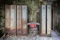 Elke locker draagt verkleuringen, vlekken en roest die wijzen op dagelijks gebruik en verval.