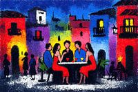 Restaurant Scène | Friends Over Drinks and Sunshine - Dit vrolijke schilderij toont een levendige restaurant scène met een groep mensen die genieten van drankjes aan een tafel, omgeven door kleurrijke huizen in felle tinten zoals rood, paars en geel.