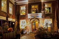 Restaurant in een oude toren in Veere, sfeervol verlicht tijdens een regenachtige avond