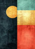 Dit minimalistische, abstracte ontwerp herinterpreteert de Australische vlag door twee contrasterende kleurblokken te gebruiken in retrokleuren turkoois blauw, mosterdgeel, verbrand oranje en donkerrood. De achtergrond heeft een korrelige papiertextuur die een old-school gevoel geeft.