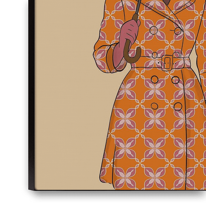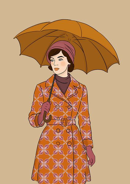 De vrouw, gekleed in een vintage jas vol grafische vormen, straalt elegantie uit. Het samenspel van retro-motieven en natuurlijke elementen creëert een kunstwerk dat zowel nostalgisch als eigentijds aanvoelt.