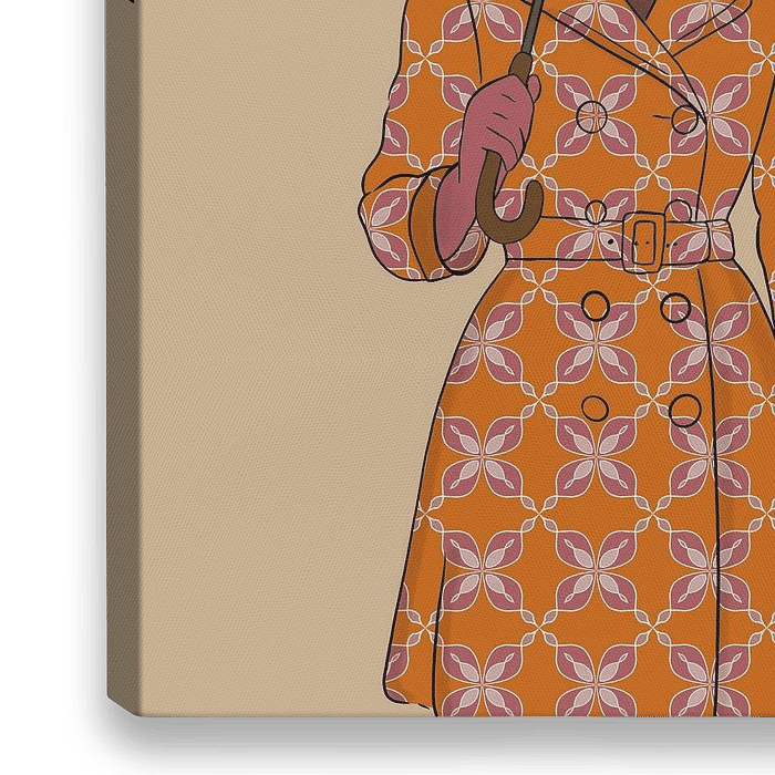 De vrouw, gekleed in een vintage jas vol grafische vormen, straalt elegantie uit. Het samenspel van retro-motieven en natuurlijke elementen creëert een kunstwerk dat zowel nostalgisch als eigentijds aanvoelt.