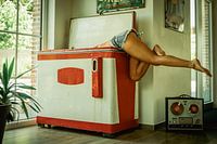 In dit intrigerende beeld vormt een strakke, moderne woning het decor voor een tijdloze scène vol sfeer en nostalgie. Het interieur is hedendaags, maar wordt tot leven gewekt door zorgvuldig gekozen vintage elementen die de ruimte karakter geven. Centraal staat de iconische ijskast uit de jaren '60, geflankeerd door een klassieke…