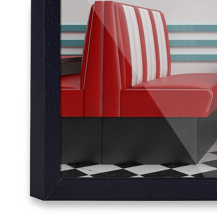 Driedimensionaal ontwerp waar twee van mijn andere ontwerpen aan de muur hangen. American diner met retro muurdecoratie. Kijk voor deze twee designs op Retro Radio Oranje en Retro Radio Turquoise.
