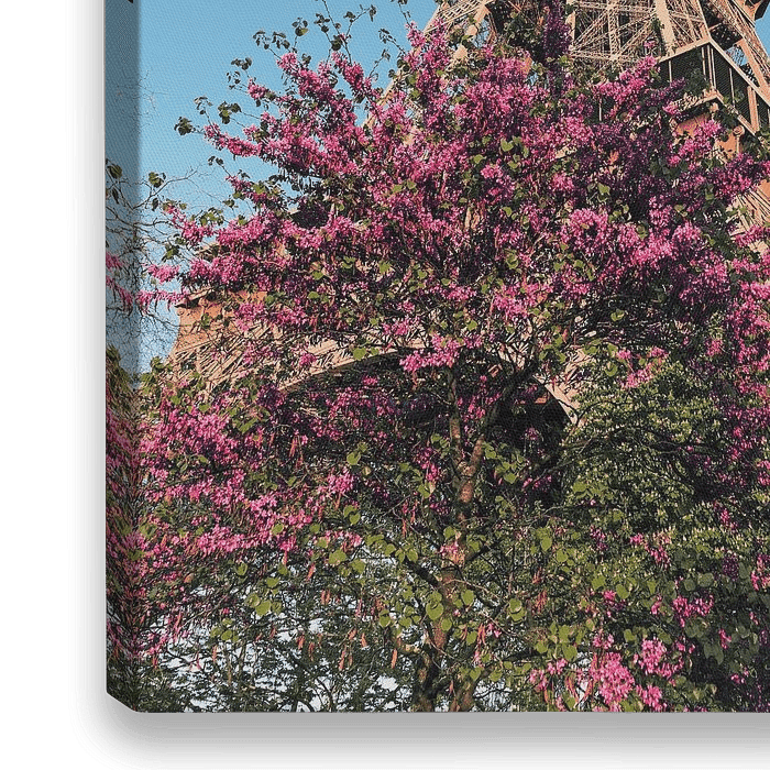 Prachtige vintage retro kleuren opname van de Eiffeltoren in Parijs, Frankrijk, in de lente met blauwe lucht en bloesem