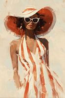 Een zomerse schilderachtig portret in warme aardetinten toont een elegante verschijning in een gestreepte witte jurk. De dramatische rode zonnehoed en retro zonnebril geven het werk een tijdloze, vintage glamour. De losse penseelstreken en het kleurgebruik creëren een sfeervol modepalet dat doet denken aan de klassieke mode-illustraties uit de jaren '50 en '60.