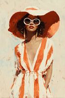 Een schilderachtig portret dat de essentie van zomerse elegantie vangt. De compositie toont een gedurfde combinatie van oranje en witte strepen in een plunging neckline jurk, gedragen met een dramatische brede hoed en opvallende witte zonnebril. De losse penseelstreken en warme kleurtonen creëren een sfeervolle retro-moderne uitstraling die doet denken aan glamoureuze stranddagen uit vervlogen tijden.