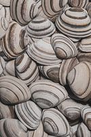 "Retro: Gestreepte schelpen in verschillende bruin tinten" is een foto van een verzameling van allerlei verschillende kleuren en formaten schelpen met streepjes. De kleuren lopen uiteen van wit - creme kleur tot bruin zwart (in retro kleuren).