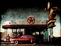 Wanneer u "Volgende service 100 mijl" bekijkt, stelt u zich voor dat u de bestuurder bent van de Chevy Fleetline uit de jaren 1950 en dat u op reis bent met de perfecte partner. Je bent in het midden van nergens tijdens je vakantie, weg van huis en je hebt gas nodig, want het volgende benzinestation is meer dan 100 km verderop. Next Service 100 mijl is de perfecte schildering om het idee te begrijpen van een verre plek die tientallen jaren geleden bestond. Het combineert alle verfraaiingen van een traditioneel 50s tankstation en integreert ondertussen de perfecte vintage arcering rond het frame van het schilderij.