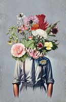 Dit is een digitaal vervaardigde collage, opgebouwd uit diverse afbeeldingen, waaronder vintage illustraties van vlinders en bloemen, op een grijze achtergrond.