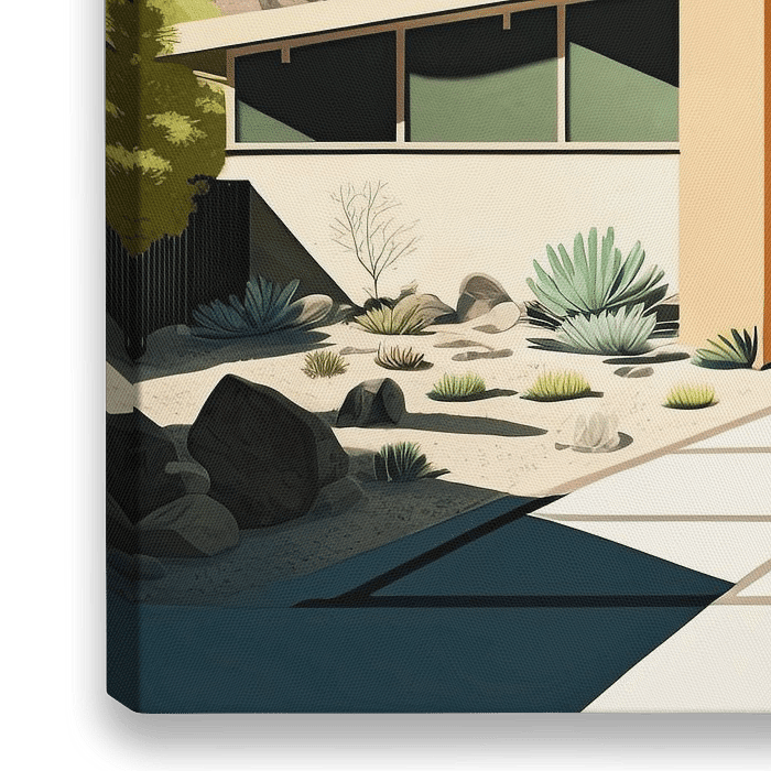 Breng de tijdloze elegantie van mid-century modern architectuur in huis met deze prachtige kunstprint van een iconische Palm Springs bungalow. Dit kunstwerk vangt de kenmerkende stijl van de jaren '50 en '60, met een minimalistisch ontwerp, een plat dak, grote ramen en een warme terracottakleurige schoorsteen. De woning is omringd door…