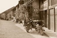 Oldtimer motoren in een rustieke straat met wasgoed en oude verweerde huizen, Chinese dorp Xingping, Yangshuo, Guilin, China. Straatbeeld in vintage sfeer. Een gevoel van nostalgie in sepia kleur, dorpsgezicht in het Verre Oosten.