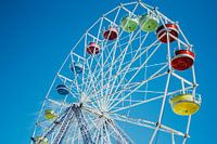 Een retro reuzenrad in verschillende kleuren tegen een blauwe hemel