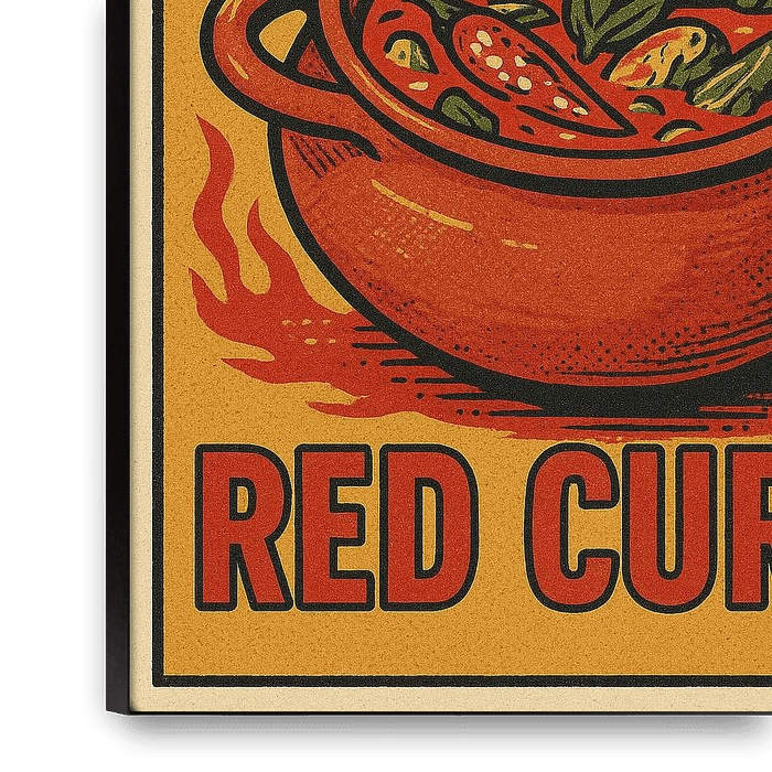 Vier de vurige smaken van Thailand met deze retro Red Curry poster, een gewaagde vintage-geïnspireerde illustratie van een van de meest iconische gerechten van het land. Het kunstwerk toont een kleipot gevuld met rode curry, chilipepers en verse kruiden, omlijst door vlammen en tempelsilhouetten op de achtergrond. Met het levendige rode…
