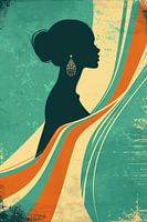Deze stijlvolle retro-illustratie toont de sierlijke silhouet van een elegante vrouw in echte 60’s-vibes. Zachte vintage-tinten zoals turquoise, warm oranje en crème stromen dynamisch door het beeld en geven het werk een speelse, bijna dansende energie. Het silhouet, strak en vrouwelijk, wordt benadrukt door haar opvallende oorbel en de…