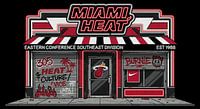 Urban graffiti winkelpui op beton met vette rode Heat accenten straattypografie en basketbal vibe leveren een aparte stad atletisch. Streetart voor Heat-fans en liefhebbers van streetwear.