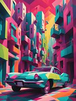 In dit kunstwerk zie je een klassieke auto die door een levendig gekleurde stedelijke straat rijdt. De gebouwen rondom de auto zijn felgekleurd in roze, blauw, groen en geel, wat een dynamisch en futuristisch stadsbeeld creëert. De geometrische vormen van de gebouwen en de contrasterende kleuren zorgen voor een opvallend visueel effect…