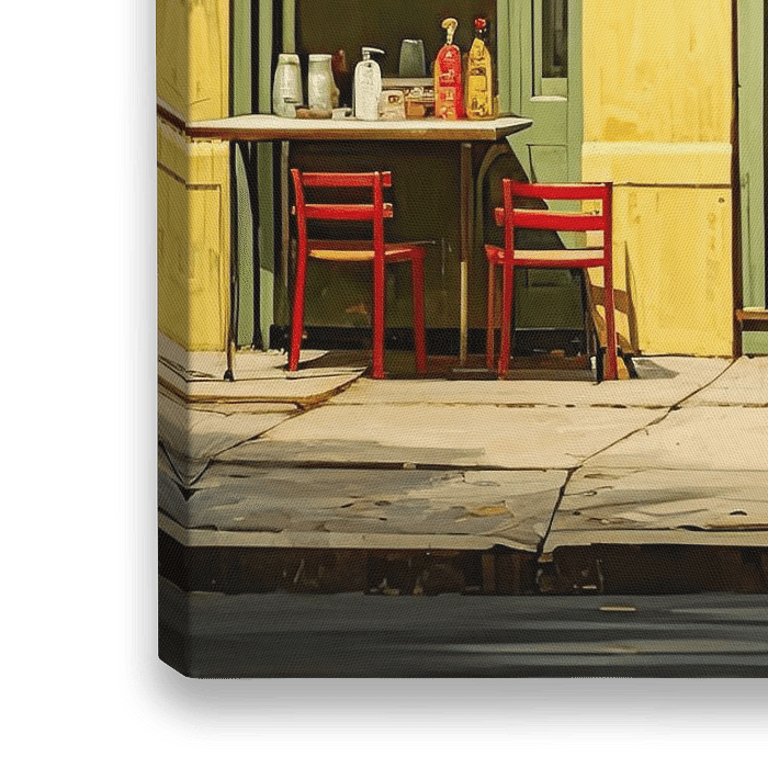 Het is avond. Een man zit op een stoel voor een klein cafe en leest een krant. Het licht werpt lange schaduwen op de stoep. In de etalage staan verschillende objecten, een tafereel dat het dagelijks leven vastlegt. Aan de rand van het beeld staat een andere figuur,…