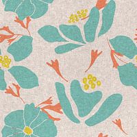 Abstracte bladeren en bloemen, klaprozen of anemoonbloemen in retrokleuren en -texturen.