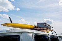 Retro bus met surfplank en koffer en wijde lucht. Geeft vakantiegevoel weer met het oog op de zomer en strandleven.