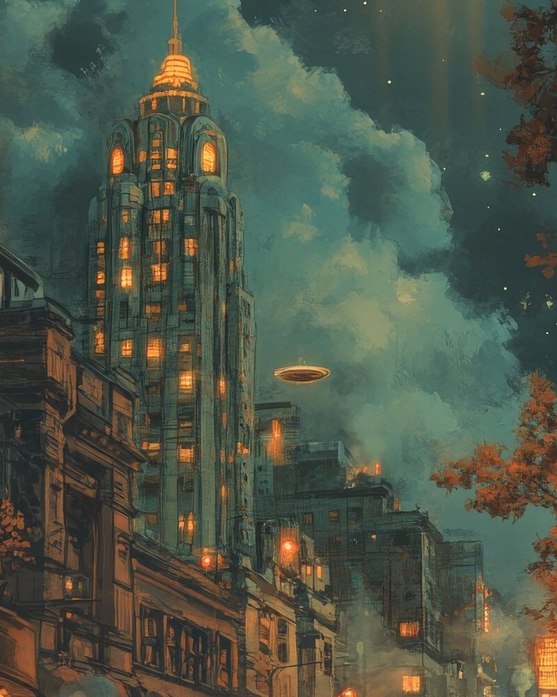 De afbeelding toont een bruisend stadslandschap dat baadt in de warme gloed van een ondergaande zon. Hoge, futuristische gebouwen omzomen de straten, versierd met neonreclames en gloeiende ramen. In de lucht zweven verschillende vliegende schotels boven de stad, wat een gevoel van verwondering en verwachting creëert. De scène is gevuld met mensen die hun dagelijkse leven leiden, over de trottoirs lopen en in oldtimers rijden.