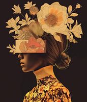 Mixed media afbeelding van een vrouw met blond haar tegen een zwarte achtergrond. Gele en oranje bloemen in het haar en op haar coltrui zorgen voor een kunstzinnig geheel en contrast met een retro gevoel. De rechthoek over haar ogen waarover een bloem valt geeft de afbeelding een speelse twist. Passend bij diverse stijlen en trends, waaronder retro, mixed media, bloemen. Artist: Bianca ter Riet. Bold Retro.