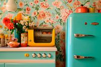 Levendige kleuren en bloemmotieven toveren deze keukenruimte om tot een oase van retro charme. De turkooizen koelkast en felgele microgolfoven plaatsen vrolijke accenten, terwijl verse bloemen in een kleurrijke vaas het geheel afmaken. Perfect voor een uitnodigende en gezellige keukenhoek die koken en genieten van eten tot een plezier maakt.
