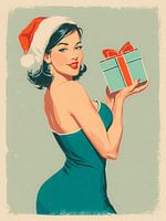 Dit kunstwerk straalt feestelijke charme en nostalgie uit. Het toont een stijlvolle vrouw in klassieke pin-up stijl uit de jaren ’50. Ze draagt een turquoise jurk die elegant haar silhouet benadrukt, gecombineerd met de iconische rode kerstmuts. In haar handen houdt ze een feestelijk ingepakt cadeau met een rode strik, dat ze glimlachend presenteert.