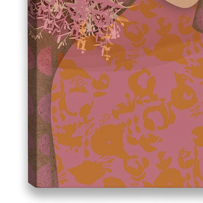 Dit semi-abstracte portret toont een vrouw met een bloemenhoed, waarbij vintage elegantie wordt gecombineerd met moderne collagetechnieken. Zachte geometrische vormen en gelaagde texturen geven het werk een tactiele kwaliteit, terwijl het kleurenpalet - warm roze, aardebruin en retro oranje - een nostalgische jaren 70 sfeer oproept. De…