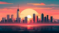 Koop de illustratie Retro stad met zonsondergang van Mustafa Kurnaz op canvas, aluminium dibond, (ingelijste) fotoprint, behang en ArtFrame, op maat geprint in Fine-Art kwaliteit.