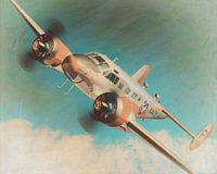 Dit schilderij van een Beechcraft 18 SNB-5 uit 1936 toont de schilderkunst van Jan Keteleer. Zijn kleurgebruik is rijk en robuust, en zijn onderwerpkeuze is historisch. Hij gebruikt warme blauwen en groenen, die worden gebruikt om de wolken in de lucht te maken en de roden en gelen die worden gebruikt om het vliegtuig te omlijnen. Een andere leuke toets op dit schilderij zijn de diepe grijzen die het gebied een zeer winterse uitstraling geven en het blauw creëert een zogenaamd winters tafereel.