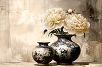 Een stilleven in retro stijl van 2 klassieke keramische vazen met daarin twee pioenrozen in een zachte tint.