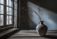 Het licht van de maan valt binnen door het oude raam, op de tafel staat een oude vintage vaas met bloesemtakken er in. Het beeld is gegenereerd met behulp van ai.