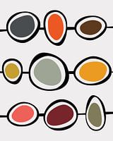 Abstracte minimalistische illustratie van ronde vormen op zwarte lijnen. De cirkels zijn gevuld met retro kleuren, waardoor het geheel een vintage look heeft. De achtergrond is licht grijs.