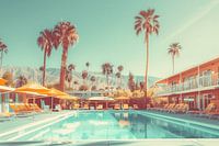 Deze afbeelding toont een retro-geïnspireerd zwembadlandschap in een zonnige, rustige omgeving. De scène wordt gekenmerkt door hoge palmbomen, felgekleurde parasols en ligstoelen rondom een helderblauw zwembad. De gebouwen hebben een vintage uitstraling met hun pastelkleuren en eenvoudige architectuur, wat een nostalgisch gevoel oproept. Het licht en de kleuren geven de afbeelding een dromerige en ontspannen sfeer, perfect voor het oproepen van herinneringen aan zomerse dagen.