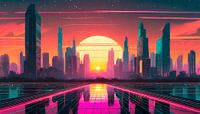 Koop de illustratie Retro zonsondergang met stad van Mustafa Kurnaz op canvas, aluminium dibond, (ingelijste) fotoprint, behang en ArtFrame, op maat geprint in Fine-Art kwaliteit.