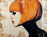 Profiel | Silent Profile - Dit vrouwen schilderij toont een gestileerd zijprofiel van een jonge vrouw met een opvallende, oranje boblijnkapsel en een donkere silhouet tegen een bleek, textuurrijk achtergrond.