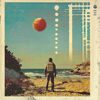 Een persoon loopt over een verlaten weg terwijl een UFO boven hem zweeft en een lichtstraal werpt. Een digitaal glitch effect overlapt een landschap van droge heuvels en verre stadsgezichten.