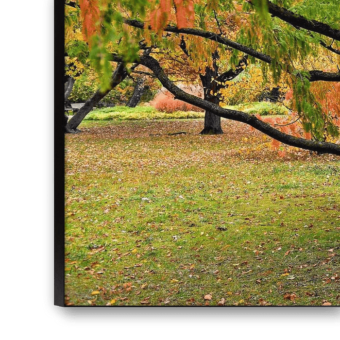 De warme rode tint in combinatie met de gele en oranje bladeren van de naburige bomen creëren een prachtige kleursfeer. Dit wordt benadrukt door het nog aanwezige groen op de bosbodem en de verschillende groentinten van de overgebleven bladeren, die een bijzonder opvallend contrast vormen.