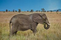 Gigantische Afrikaanse olifant in de savanne tegen de blauwe hemel