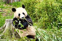Reuzenpanda die bamboe eet. De bedreigde beer uit Azië met zwart-witte vacht. Dierenfoto van een uniek zoogdier.