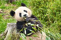 Reuzenpanda die bamboe eet. De bedreigde beer uit Azië met zwart-witte vacht. Dierenfoto van een uniek zoogdier.