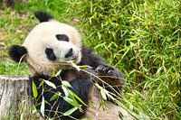 Reuzenpanda die bamboe eet. De bedreigde beer uit Azië met zwart-witte vacht. Dierenfoto van een uniek zoogdier.
